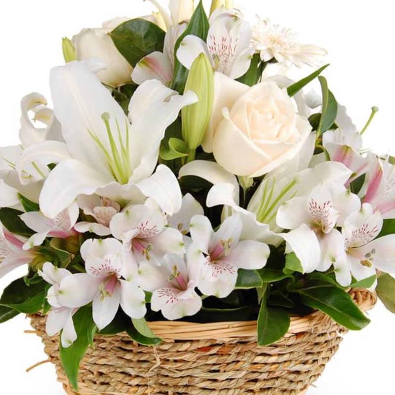 3 розы, 1 ветка белой лилии, 7 альстромерий, зелень, корзина, оазис.