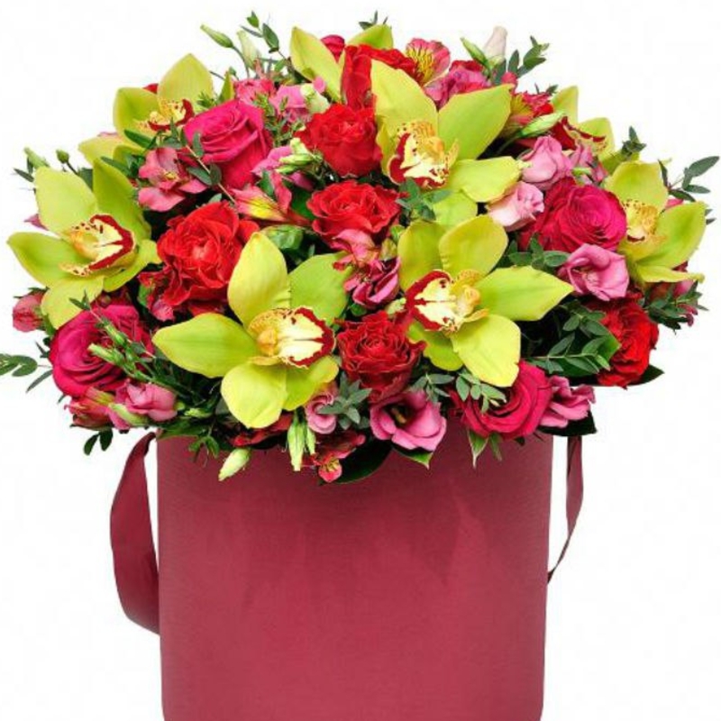 Букет состоит из 9 орхидей, 7 роз, 2 кустовые розы, 2 эустомы, 2 альстромерии, 2 фрезии, зелень, коробка, оазис.
