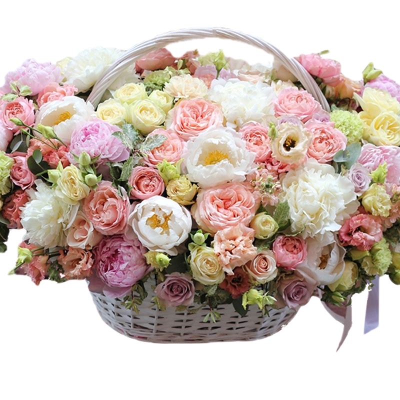 Букет состоит из 20 пионов, 11 пионовидных роз, 9 кустовых роз, 7 пионовидных кустовых роз, 7 веток эустомы, 5 альстромерий, 7 гвоздик, зелень, корзина, оазис.