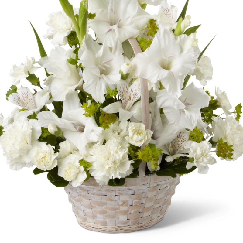 Букет состоит из 9 гладиолусов, 8 гвоздик, 4 ветки альстромерии, 6 веток кустовой гвоздики, зелень, корзина, оазис.