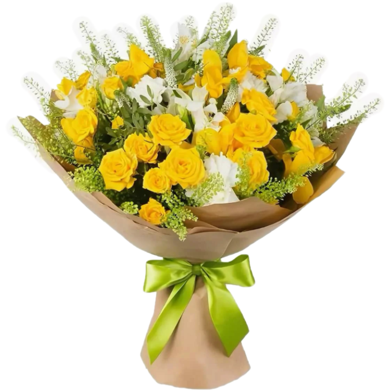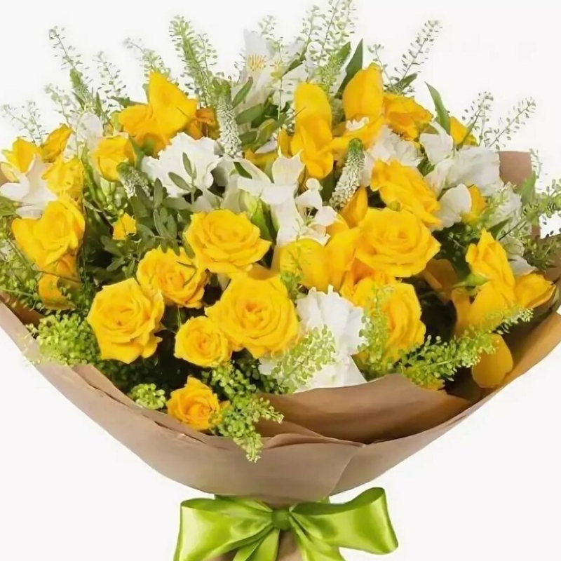 Букет состоит из 11 веток желтой кустовой розы, 7 белых хризантем, 5 веток альстромерии, зелень, крафт, атласная лента.