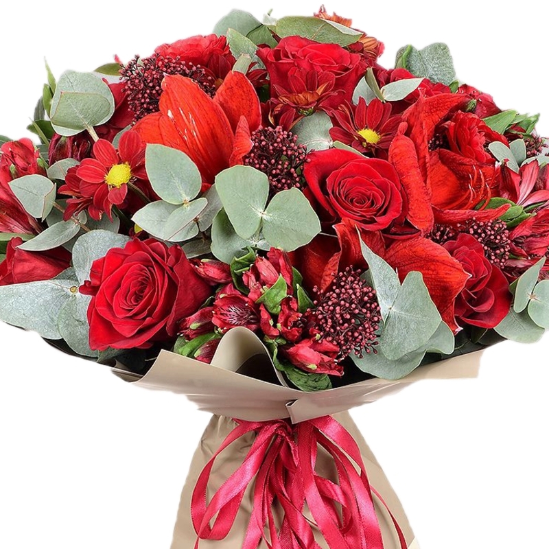 Букет состоит из 9 роз, 3 ранункулюса, 3 кустовых хризантемы, 1 амариллис, 7 веток альстромерии, 5 скиммия, зелень, крафт, атласная лента.