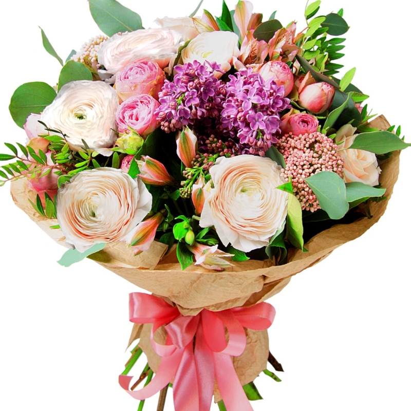 Букет состоит из 5 ранункулюсов, 2 розы, 2 ветки кустовых роз, 2 альстромерии, 1 сирень, 3 озотамнус, зелень, крафт, атласная лента.