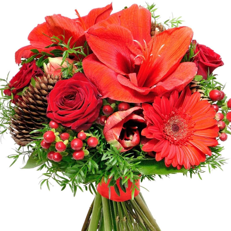 Букет состоит из 5 гербер, 9 роз, 3 амариллиса, 5 веток гиперикума, 1 альстромерия, зелень, шишки, прозрачная упаковка, атласная лента.