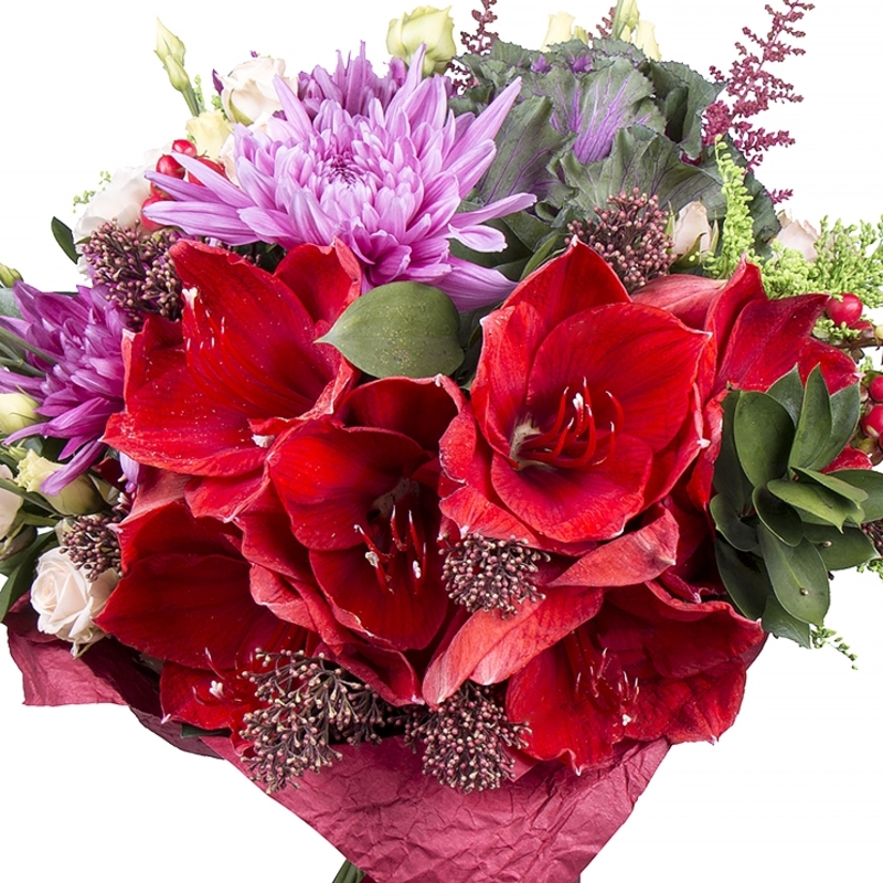 Букет состоит из 3 амариллиса, 3 хризантемы, 2 ветки эустомы, 2 брассики фиолетовые, 2 ветки гиперикума, 2 ветки кустовой розы, 3 солидаго, 5 скиммия, 7 астильба, зелень, крафт, атласная лента.