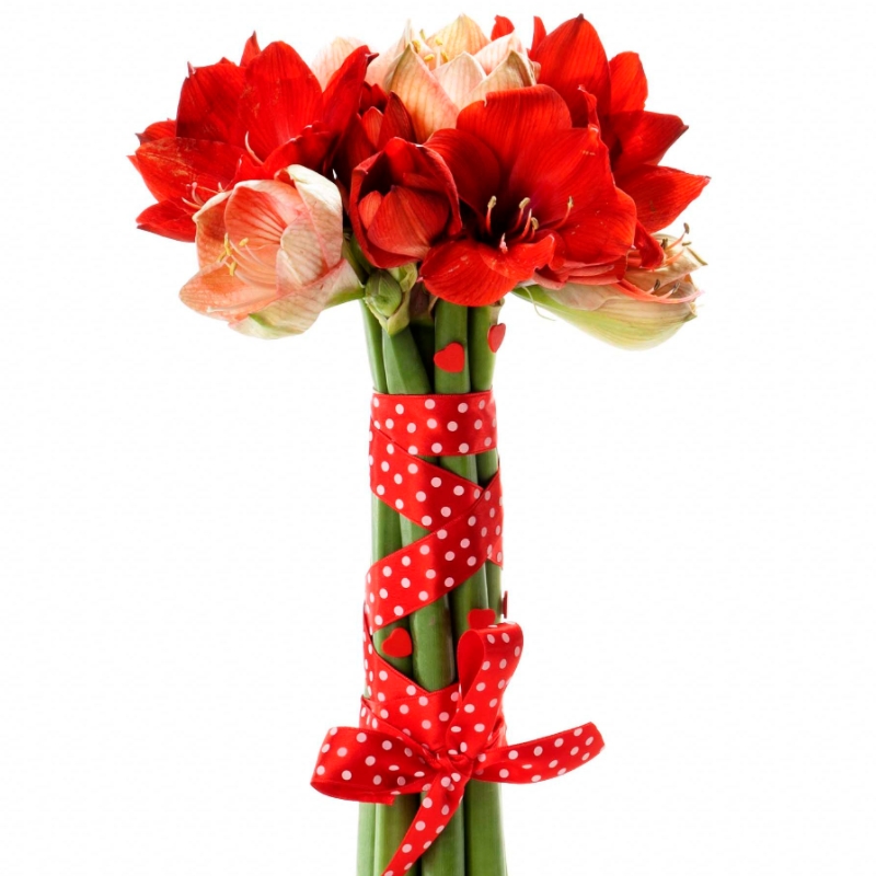 Букет состоит из MIX из 7 амариллисов, прозрачная упаковка, атласная лента.