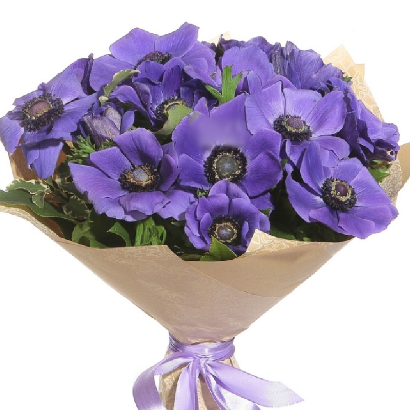 Букет состоит из 19 синих анемонов, зелень, крафт, атласная лента.