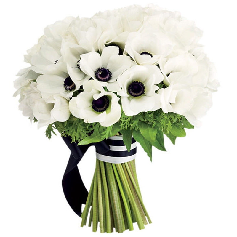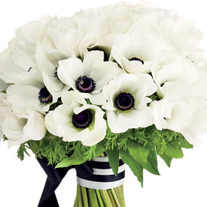 Букет состоит из 35 белых анемонов, зелень, прозрачная упаковка, атласная лента.