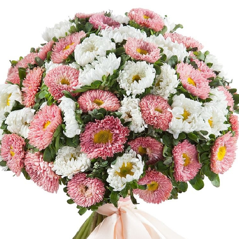 Букет состоит из 23 белые астры, 22 розовые астры, зелень, прозрачная упаковка, атласная лента.