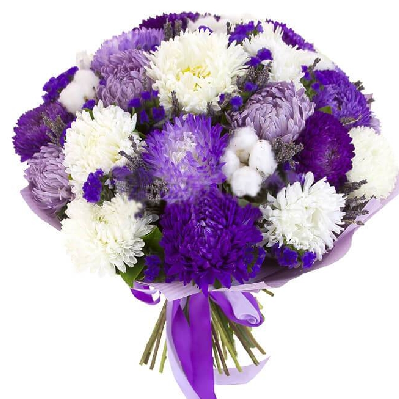 Букет состоит из MIX из 21 астры, 5 статица, хлопок, прозрачная упаковка, атласная лента.