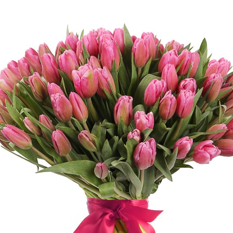 Букет состоит из 101 розовый тюльпан, прозрачная упаковка, розовая лента.