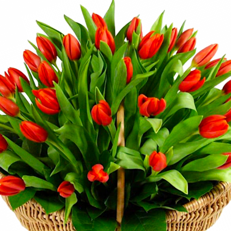 Красные тюльпаны в корзине 101 шт