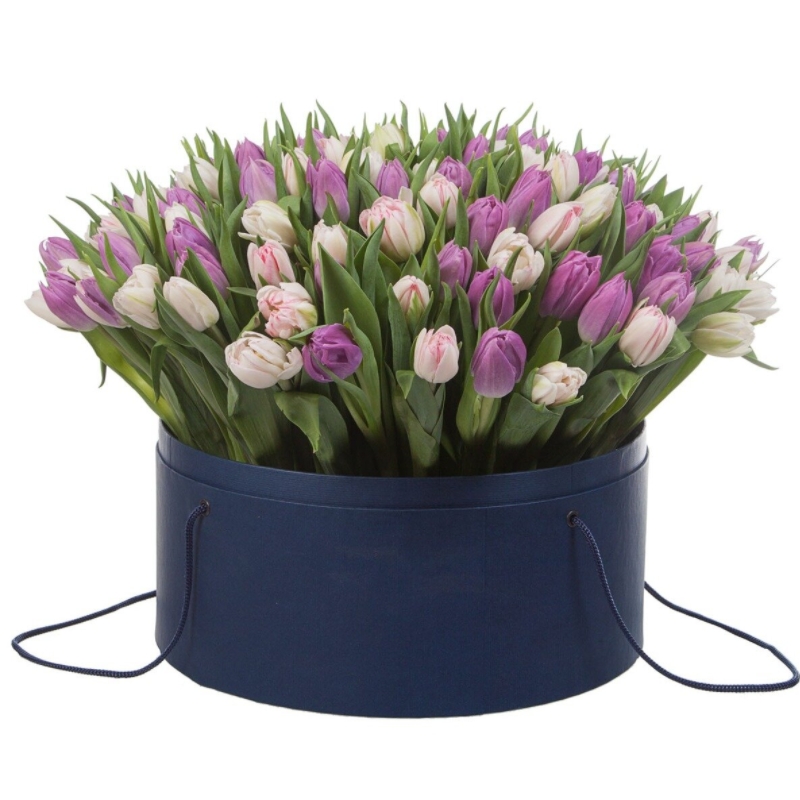 Букет состоит из 51 сиреневый тюльпан, 50 белых тюльпанов, коробка, оазис.