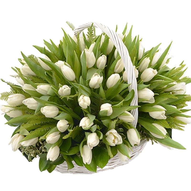 Белые тюльпаны в корзине 101 шт