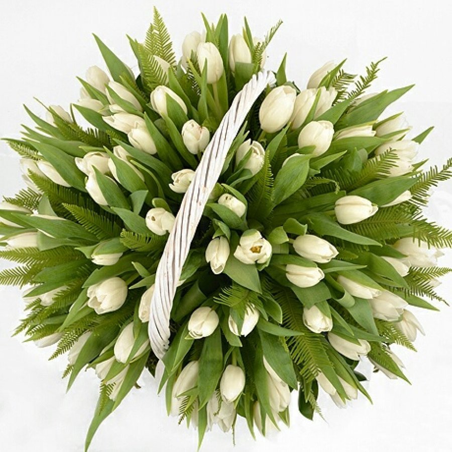 101 белый тюльпан, зелень, корзина.
