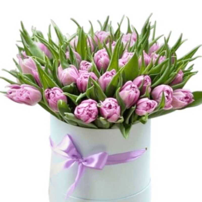 Букет состоит из 35 пионовидных тюльпанов, коробка, атласная лента, оазис.