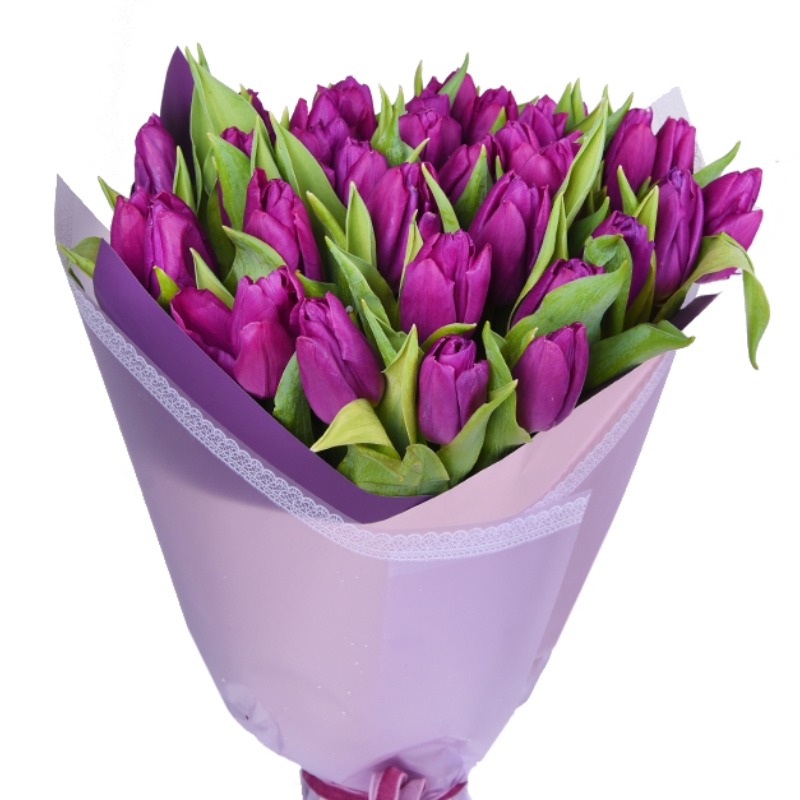 Букет состоит из 35 сиреневых тюльпанов, красивая упаковка, атласная лента.
