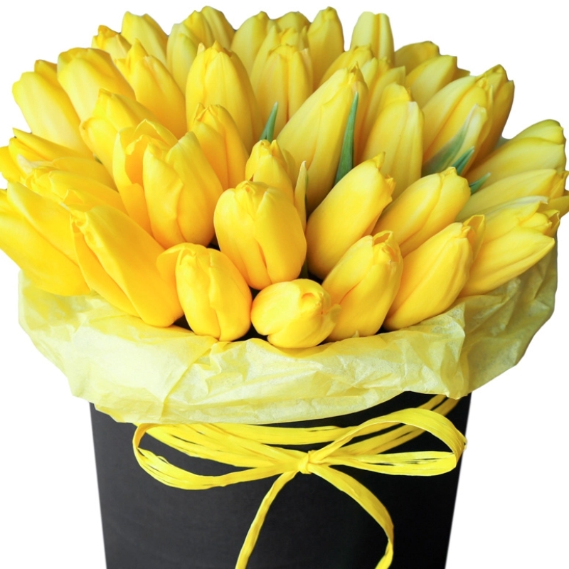 35 желтых тюльпанов, черная коробка, желтая лента.