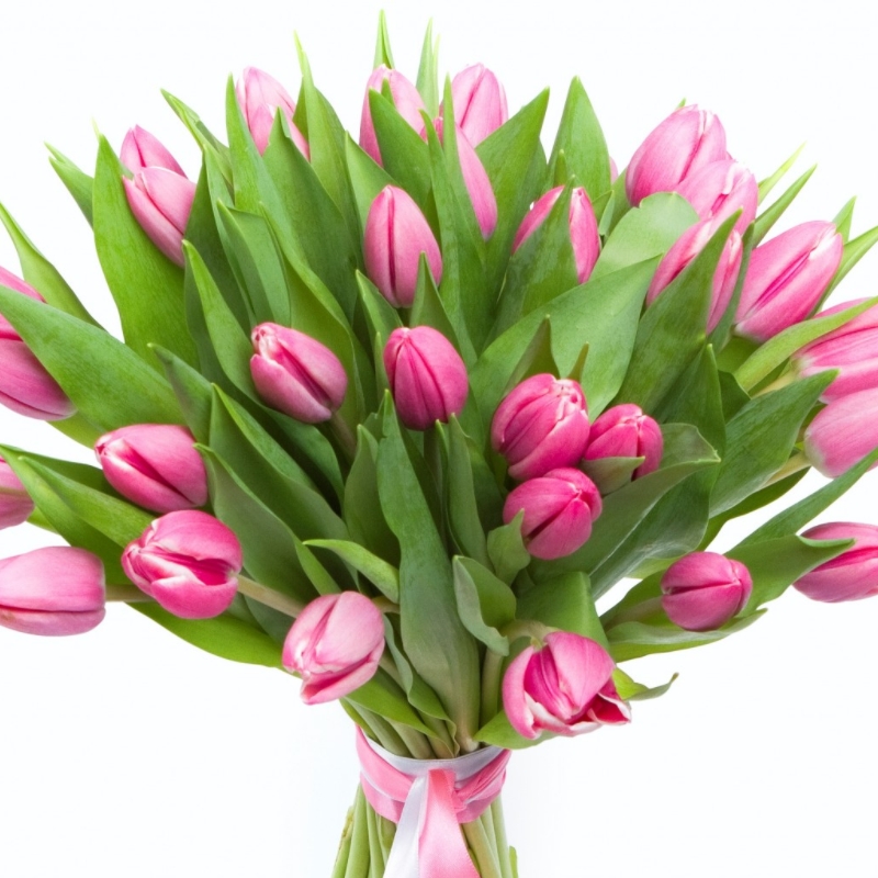 Букет состоит из 35 розовых тюльпанов, прозрачная упаковка, атласная лента.