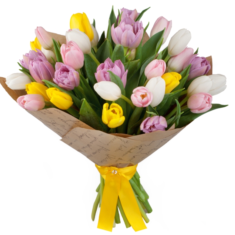 Букет состоит из 35 разноцветных тюльпанов, крафт, атласная лента.