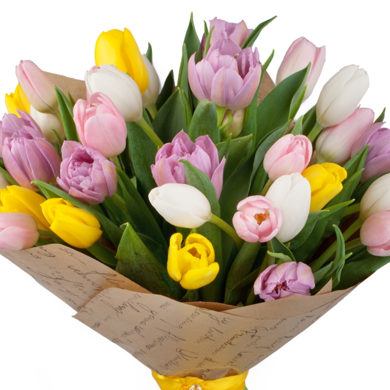 Букет из 35 разноцветных тюльпанов в крафте