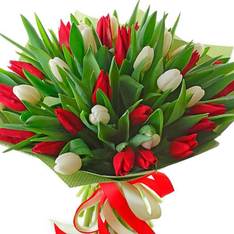 Букет состоит из 18 красных тюльпанов, 17 белых тюльпанов, красивая упаковка, атласная лента.