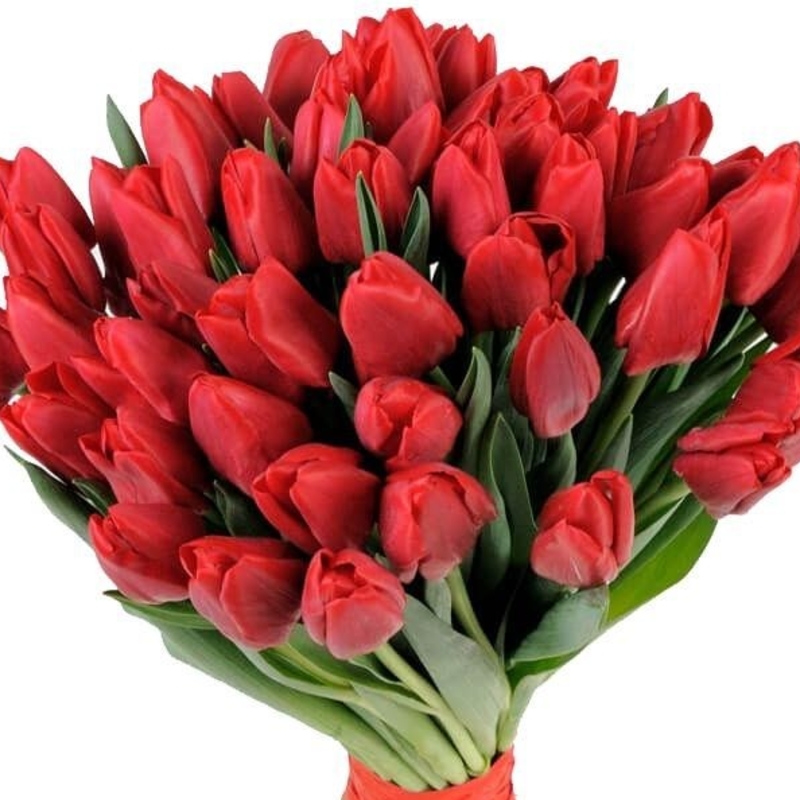 Букет состоит из 35 красных тюльпанов, прозрачная упаковка, атласная лента.