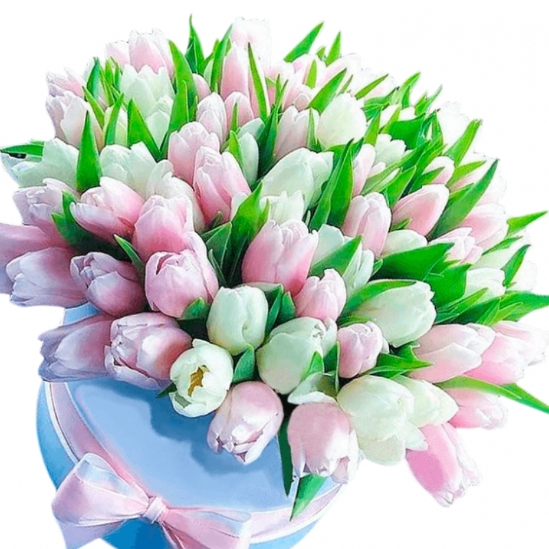 Букет состоит из 26 белых тюльпанов, 25 розовых тюльпанов, коробка, атласная лента, оазис.