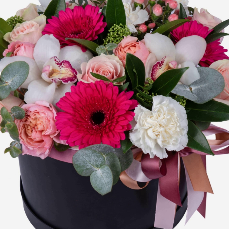 Букет состоит из 9 роз, 1 ветка пионовидной розы, 3 гвоздики, 3 герберы, 3 орхидеи, 3 гиперикум, 3 скиммия, зелень, коробка, оазис, атласная лента.