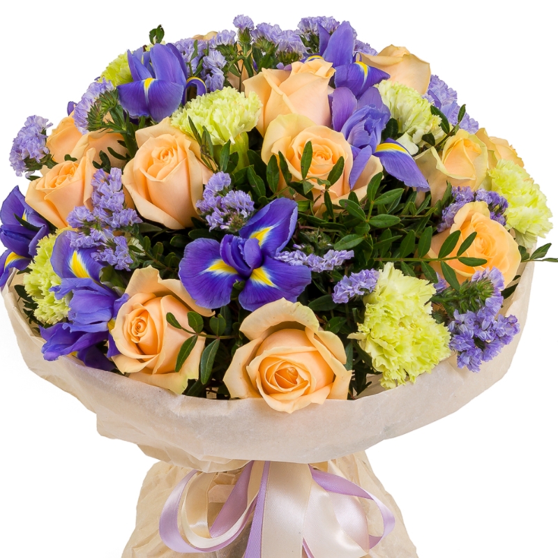 Букет состоит из 11 кремовых роз, 7 гвоздик, 7 ирисов, 6 статица, зелень, крафт, атласная лента.
