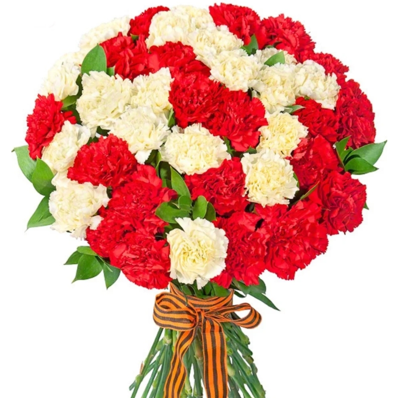 Букет состоит из 26 красных гвоздик, 25 белых гвоздик, зелень, прозрачная упаковка, лента.