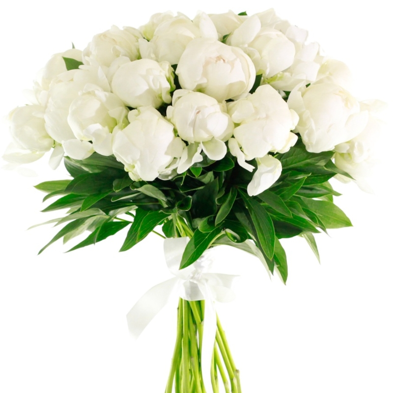 Букет состоит из 25 белых пионов, прозрачная упаковка, атласная лента.