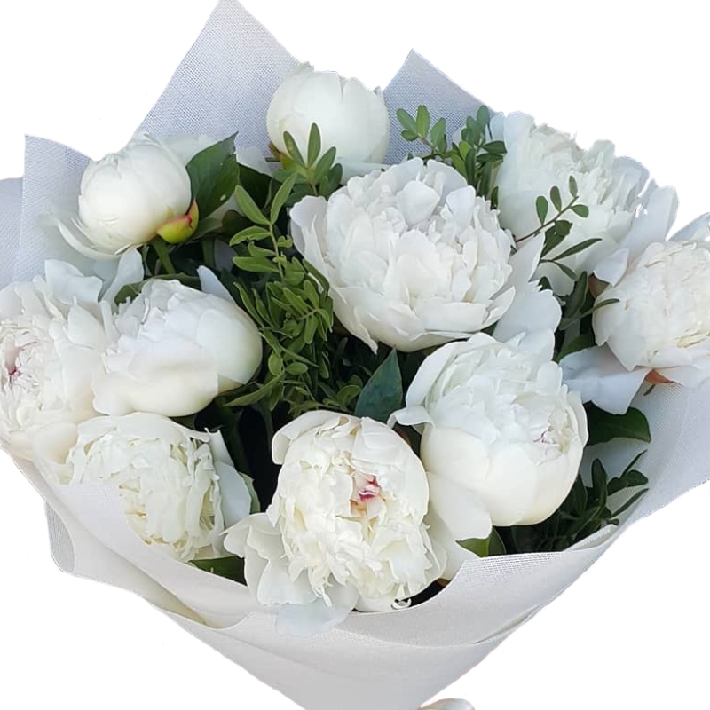 Букет состоит из 11 белых пионов, зелень, красивая упаковка, атласная лента.