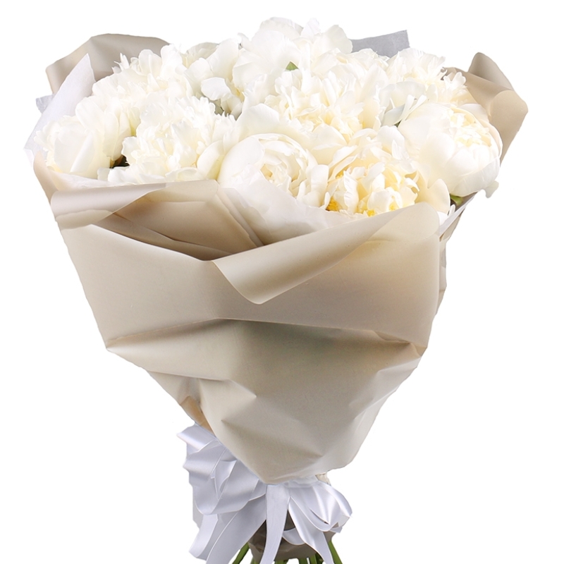Букет состоит из 17 белых пионов, крафт, атласная лента.