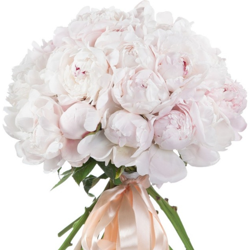 Букет состоит из 51 белый пион, прозрачная упаковка, атласная лента.
