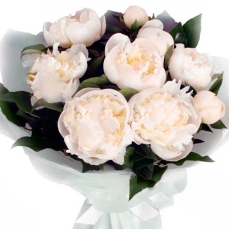 Букет состоит из 9 белых пионов, салал, красивая упаковка, атласная лента.