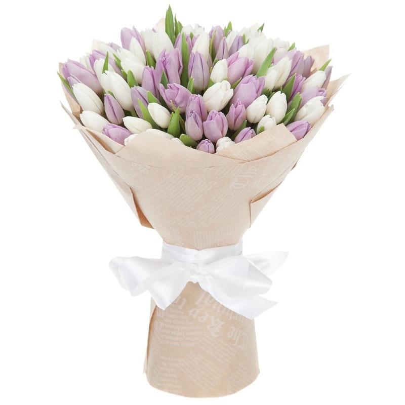Букет состоит из 38 белых тюльпанов, 37 сиреневых тюльпанов, крафт, атласная лента.