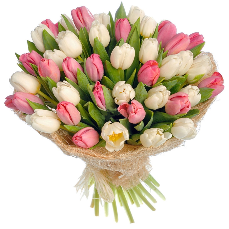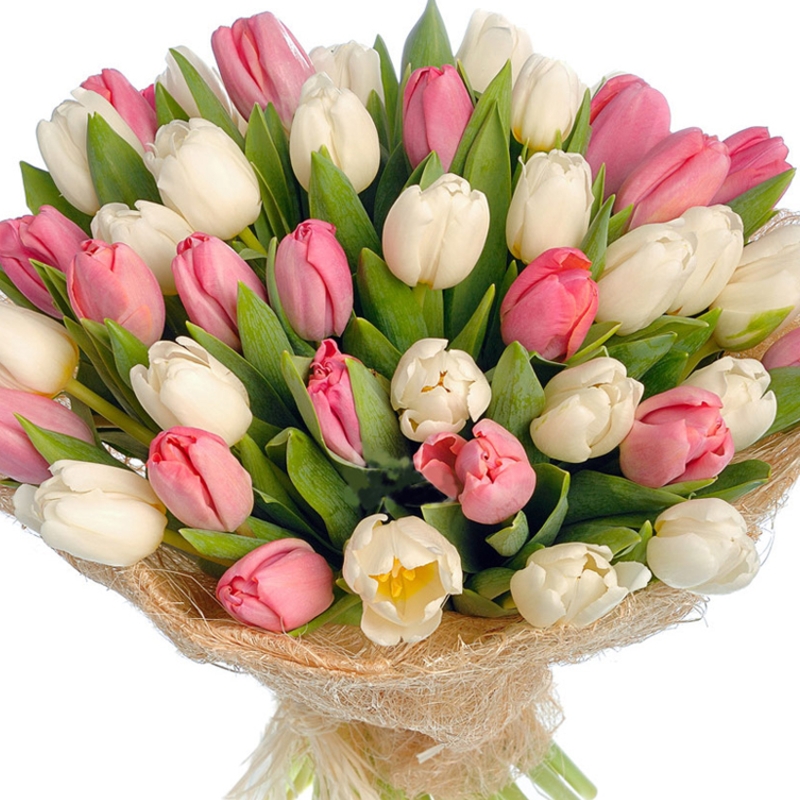 Букет состоит из 23 белых тюльпана, 22 розовых тюльпана, красивая упаковка, атласная лента.