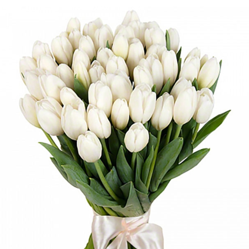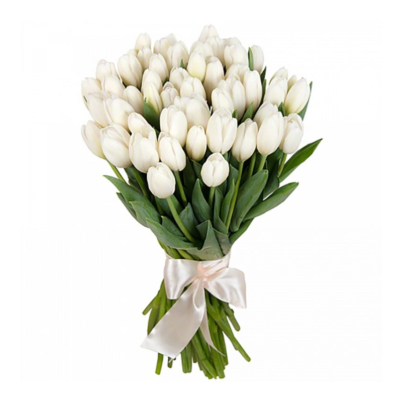 Букет состоит из 45 белых тюльпанов, прозрачная упаковка, атласная лента.