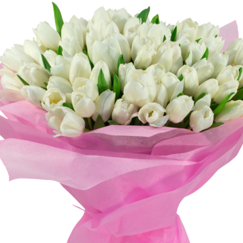 Букет состоит из 75 белых тюльпанов, розовая упаковка, атласная лента.