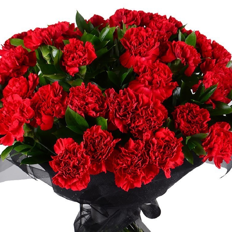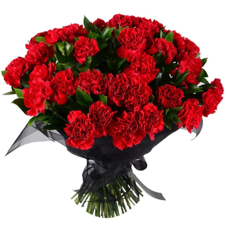 Букет состоит из 40 красных гвоздик, зелень, органза, лента.
