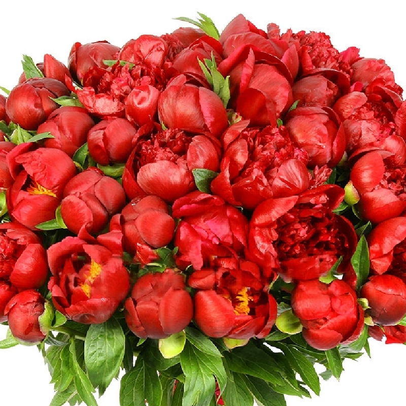 Букет состоит из 51 красный пион, прозрачная упаковка, атласная лента.