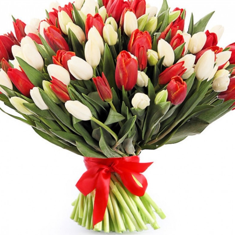 Букет состоит из 51 красный тюльпан, 50 белых тюльпанов, прозрачная упаковка, атласная лента.