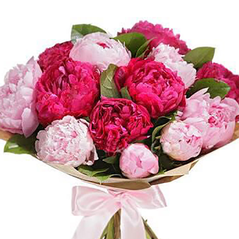 Букет состоит из 8 красных пионов, 7 розовых пионов, зелень, крафт, атласная лента.