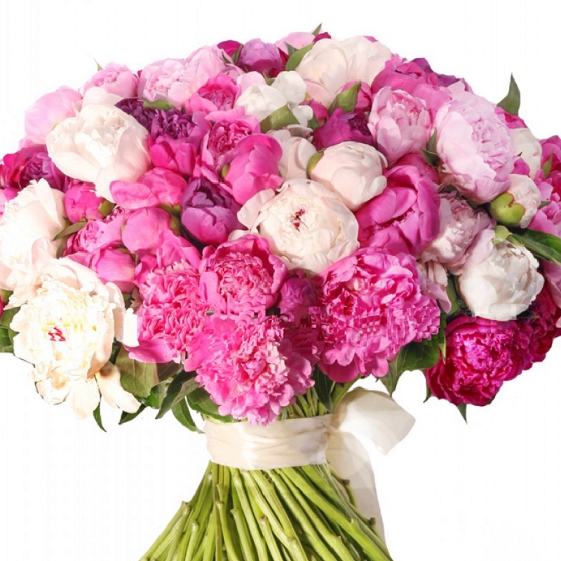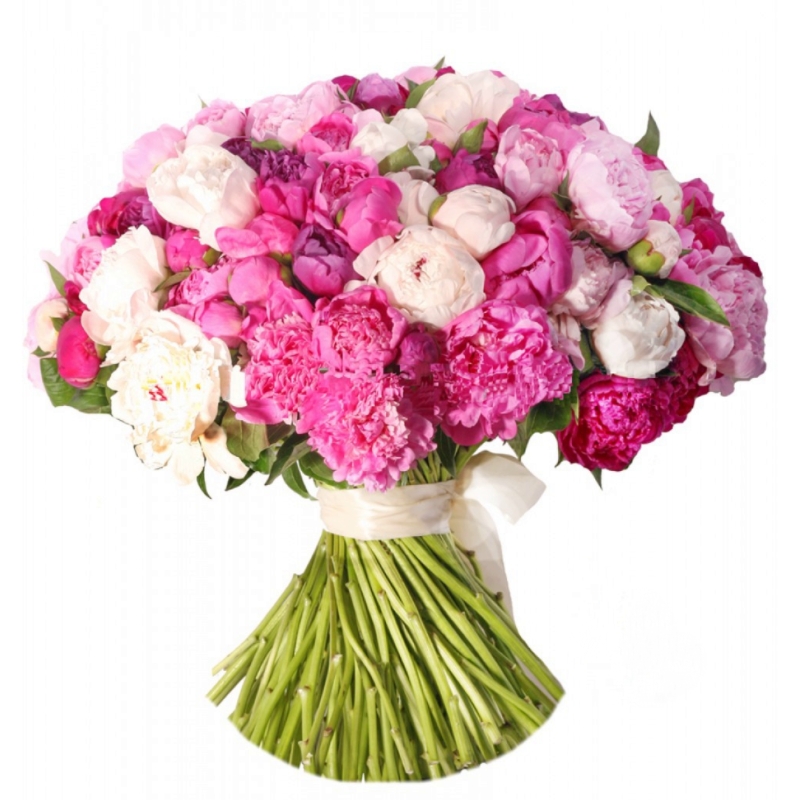 Букет состоит из MIX из 51 пиона, прозрачная упаковка, атласная лента.
