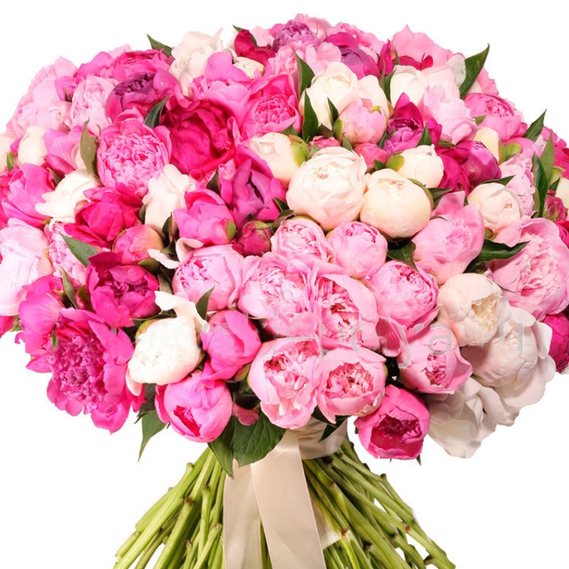 Букет состоит из 51 розовый пион, 50 белых пионов, прозрачная упаковка, атласная лента.