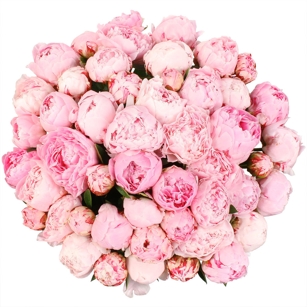 Букет состоит из 101 розовый пион, прозрачная упаковка, розовая лента.