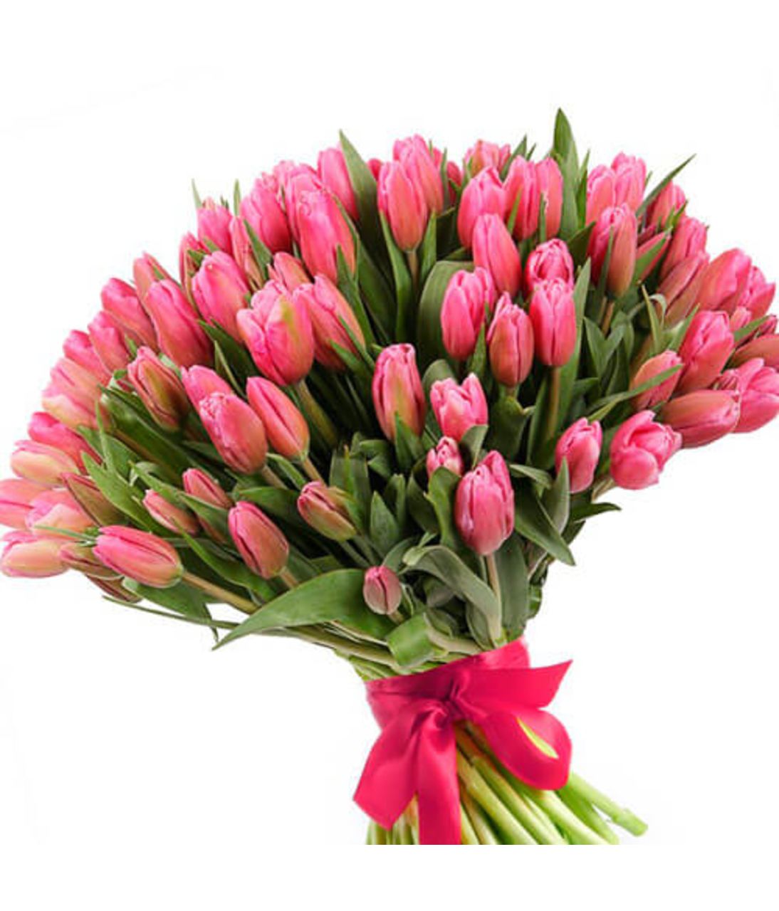 Букет состоит из 75 розовых тюльпанов, прозрачная упаковка, розовая лента.