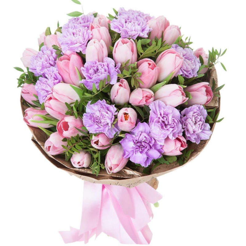 Букет состоит из 30 розовых тюльпанов, 13 сиреневых гвоздик, зелень, крафт, атласная лента.