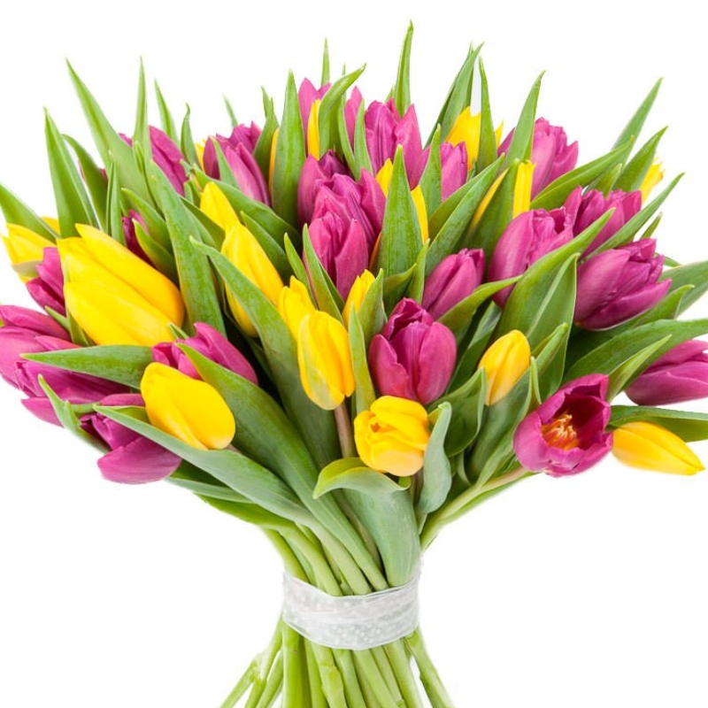 Букет состоит из 26 сиреневых тюльпанов, 25 желтых тюльпанов, прозрачная упаковка, атласная лента.